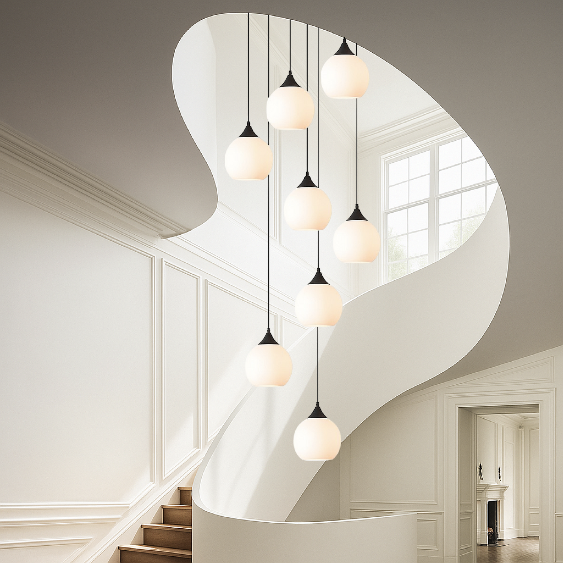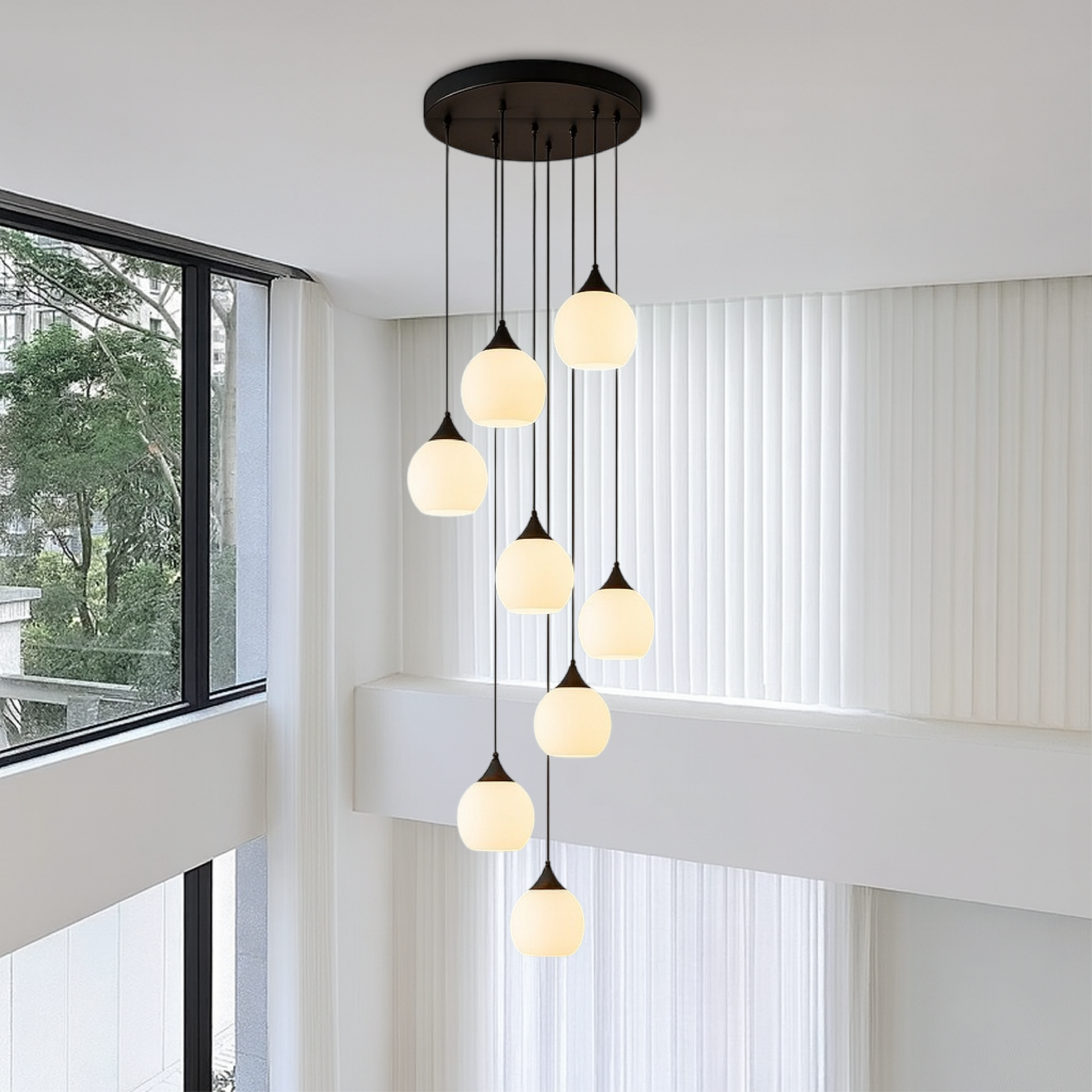 A cascading cluster of frosted glass pendants radiates soft, warm light, creating an atmosphere of understated luxury and vertical elegance. Crafted for high-ceilinged spaces, this fixture combines sculptural design with luminous comfort.