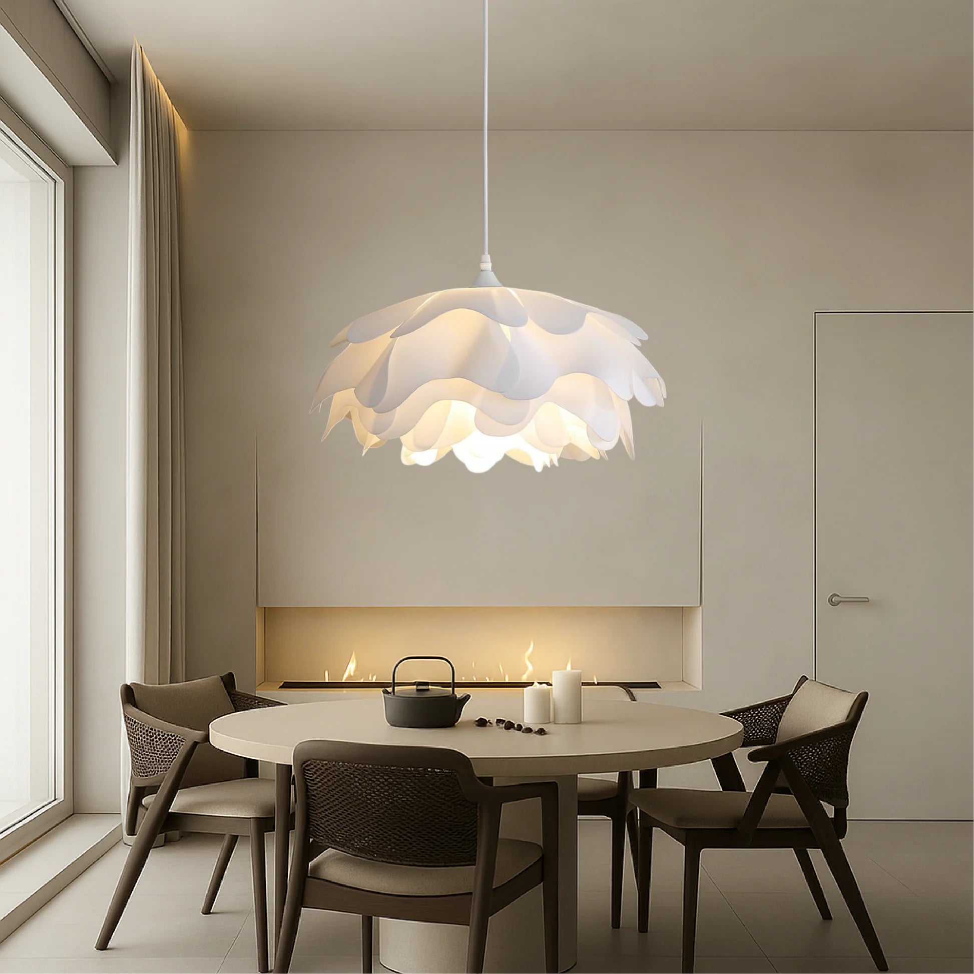 No, the Peony Mud Pendant Light is not dimmable. It is designed to provide a consistent and softly diffused illumination with a fixed Warm White color temperature (3000K). The sculptural, petal-inspired form gently filters the light, creating a calm and inviting atmosphere. Ideal for dining and living spaces, it delivers visual warmth and artistic presence, focusing on ambiance and design rather than adjustable brightness.